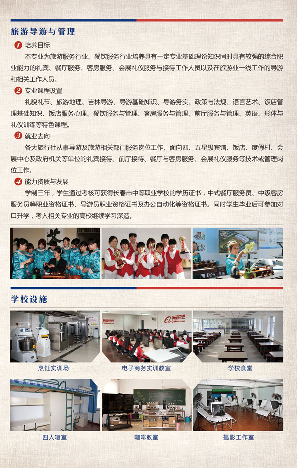 长春香格里拉大饭店、南湖宾馆、吉林省机关事务管理局、吉林省外国企业服务有限公司、吉林省环亚国际旅行社、吉林省天马旅行社、长春中之杰实业有限公司、龙嘉机场、移动通讯公司、欧亚集团、卓展购物中心、吉利汽车4S店、广汽菲亚特长春4S特约店、长春深度网络科技有限公司、吉林省平达旅游公司、大连金石滩国际会议中心、省政府驻京办事处等多家单位建立了稳固的就业基地,同时在北京、大连、深圳等城市也建立了稳固的校外实习和就业基地。