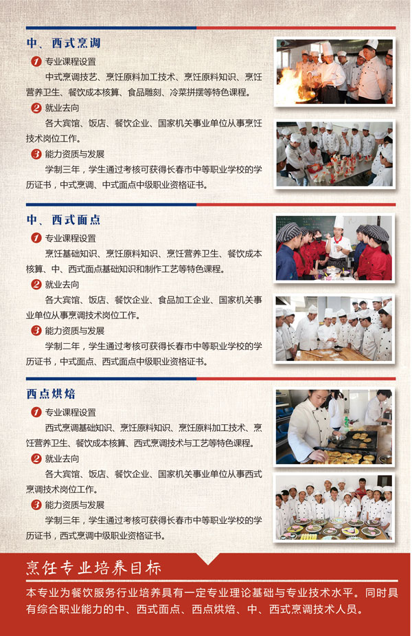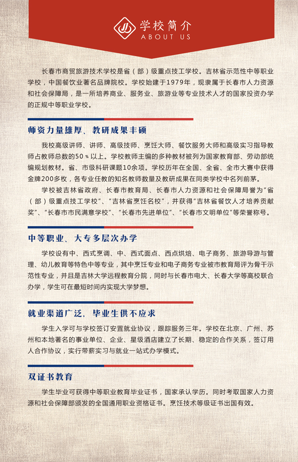 学校始建于1979年,是国家财政全额拨款事业单位,国家公办学校。建校以来,先后获得中国餐饮 业最佳品牌院校、省部级重点学校、吉林省示范性中等职业学校、吉林省烹饪名校、长春市民满意职业学校等荣誉称号。